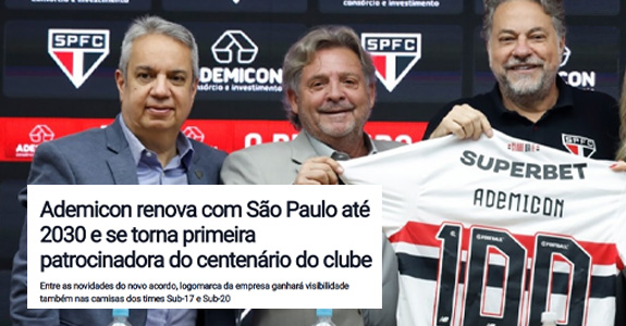A maior marca independente de Consórcios do Brasil pensa grande. Tanto que é o primeiro patrocinador do Centenário do SPFC, presente NA camisa TRICOLOR até pelo menos 2030. Afinal, Consórcio é planejamento de longo prazo.